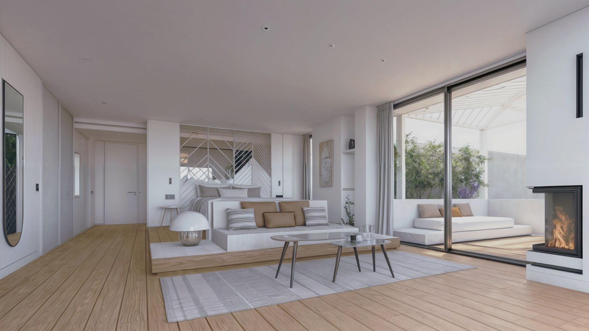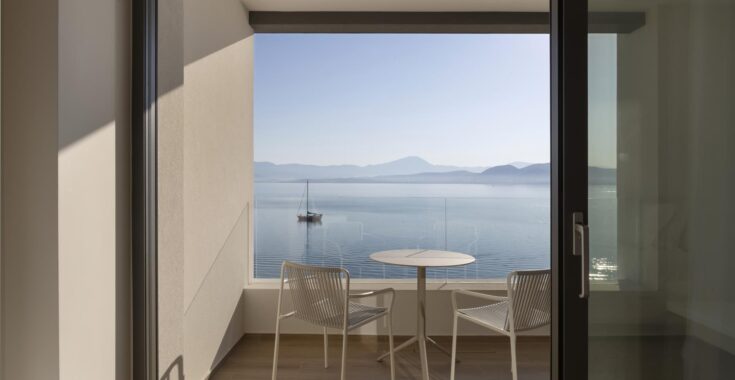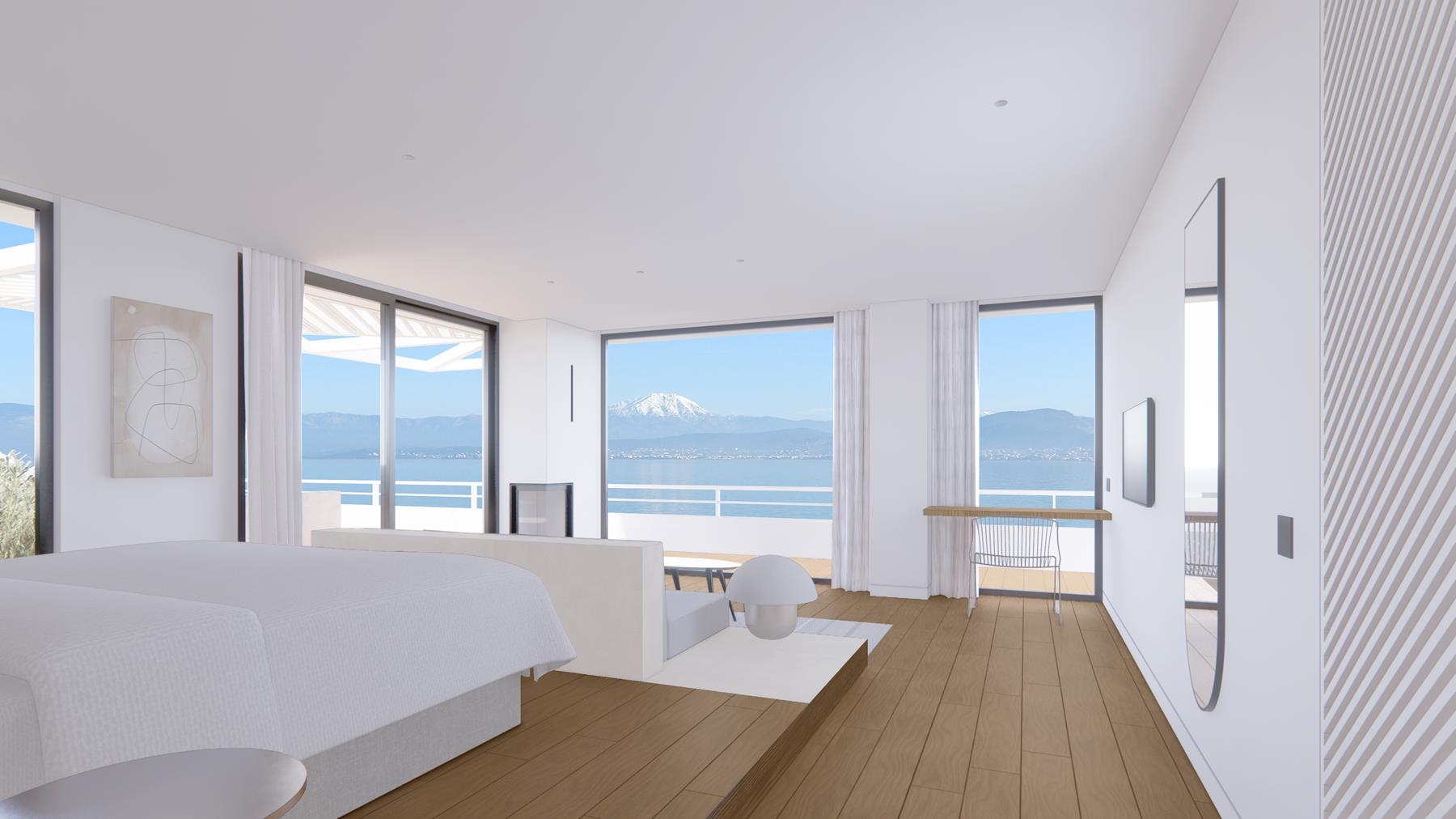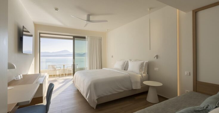 Η σουίτα περιλαμβάνει άνετο εσωτερικό σαλόνι, δημιουργώντας ένα ήρεμο και κομψό περιβάλλον για χαλάρωση καθ’ όλη τη διάρκεια της ημέρας. Το φυσικό φως αναδεικνύει την αίσθηση ανοιχτού ορίζοντα και ενσωματώνει το τοπίο στην εμπειρία διαμονής.